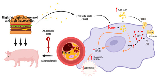 Herein, we conducted untargeted lipidomic profiling of atherosclerotic aortas in Wuzhishan miniature pigs subjected to either a normal chow (NC) diet or a high-fat, high-cholesterol, and high-fructose (HFCF) diet for six months. Moreover, transcriptome sequencing was employed to investigate the potential mechanisms behind HFCF diet-induced aortic ceramide accumulation, apoptosis, and inflammation in atherosclerotic pigs. Furthermore, in vitro experiments demonstrated the role of the long-chain C16 ceramide in macrophage iron overload and the activation of downstream pathways.