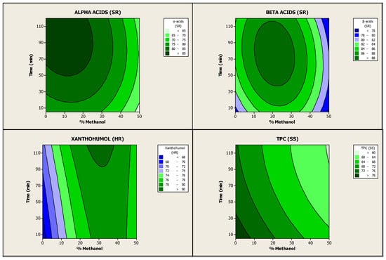 Contour plots between coupled recovery yields of α- and β-acids in soft resins, xanthohumol in hard resins and TPC in spent solids as a function of methanol concentration (%, v/v) and stirring or extraction time (min).
