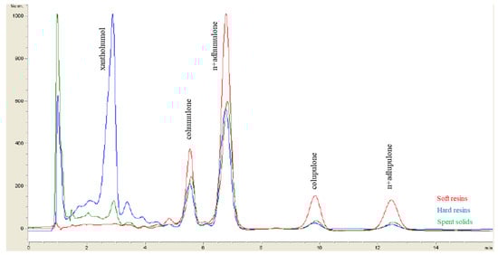 Comparison of the HPLC-DAD chromatograms of the soft resins, the hard resins and the spent solids obtained by applying the optimum conditions for the S-L extraction of hop pellets (Nugget variety) followed by sequential extraction. Note: The α-acids concentration was calculated as the sum of cohumulone and n+adhumulone and the β-acids concentration as the sum of colupulone and n+adlupulone.