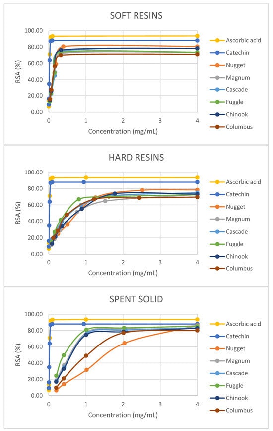 With regard to the results obtained with the DPPH radical-scavenging assay, the RSA values were expressed as the ratio percentage between the decrease in absorbance of the sample and the absorbance of the DPPH solution in the absence of the hop fraction at 517 nm. In Figure 4, it can be seen that the scavenging activity of all the hop-derived fractions on DPPH radicals increased with increasing concentration and reached values close to those attained by ascorbic acid or catechin (reference antioxidant compounds). Furthermore, the highest RSAmax values (p < 0.05) were achieved with spent solids, ranging from 74.82% at 1.01 mg/mL (Chinook) to 86.36% at 5.10 mg/mL (Nugget) (Table 5). In the case of soft resins, with high humulones and lupulones content, RSAmax values varied from 69.93% at 0.32 mg/mL (Columbus) to 80.57% at 0.39 mg/mL (Nugget) and these values were in agreement with those reported by Ting et al. [] for humulone (74% of RSAmax) and colupulone (77% of RSAmax). For hard resins, RSAmax values varied from 67.00% at 1.22 mg/mL (Columbus) to 78.08% at 2.52 mg/mL (Nugget). On the other hand, the best EC50 results (p < 0.05) were attained with soft resins, with values ranging from 0.14 ± 0.01 mg/mL (Columbus and Chinook) to 0.21 ± 0.00 mg/mL (Magnum). For hard resins, EC50 values were between 0.51 ± 0.02 mg/mL (Fuggle) and 0.83 ± 0.02 mg/mL (Nugget) and for spent solids between 0.51 ± 0.00 mg/mL (Fuggle) to 1.59 ± 0.02 mg/mL (Nugget). Regarding EC50 values for hard resins, the results obtained were comparable to those reported by Kontek et al. [] for Marynka hop (0.484 ± 0.003 mg/mL), while the EC50 values for soft resins were lower than those mentioned in the cited paper (0.294 ± 0.002 mg/mL). Besides, other works [,] reported a stronger activity against DPPH for hop extracts rich in bitter acids than those rich in prenylflavonoids.