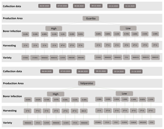 At the level of biotic stress, plant samples were selected with a precise level (4–11%) and a low level (0–4%) of borer (Diatraea saccharalis) infection and plants from different harvestings (1st–7th). For the study, the sugarcane variety was also considered (SP813250, SP803280, CU0618, RB985476, CTC4, CU7870, CTC15, RB966928, CTC9001). Figure 1 describes the sampling information used in this study.