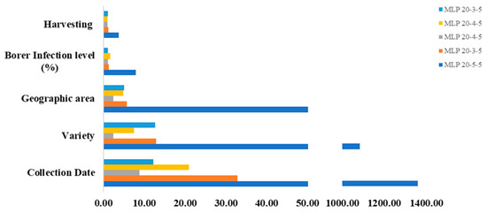 The input variables that are particularly crucial in the constructed models for the accurate prediction of the desired output variables were found using sensitivity analysis. Sensitivity analysis was carried out for the MLP models for all target outputs. The results are presented in Figure 3 and demonstrate that geographic area, variety, and collection date were the three variables with higher impact on sugarcane straw polyphenol variation for all MPL models.