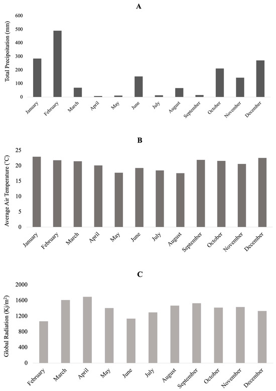 Monthly precipitation (A), air temperature (B), and global radiation (C) from 2020 at the station of Mirante de Santana, São Paulo, Brazil.