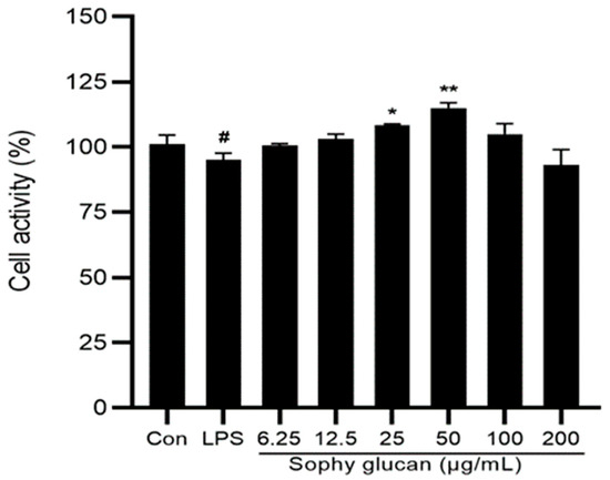 Cell viability was detected by 3-(4,5-dimethyl thiazol-2-yl)-2,5-diphenyl tetrazolium bromide (MTT) reduction assay [23]. Briefly, Caco-2 cells at a density of 5 × 105 cells were treated with different concentrations of sophy β-glucan (0, 6.25, 12.5, 25, 50, 100, and 200 μg/mL) and LPS (50 μg/mL) for 24 h. Then, 10 μL of MTT solution (5 mg/mL, Beyotime, Nanjing, China) was added and further incubated for 2 h at 37 °C. Finally, after the removal of the supernatant, 100 µL of dimethyl sulfoxide was added to measure the absorbance at 450 nm. Cell viability was expressed as the percent of untreated cells.