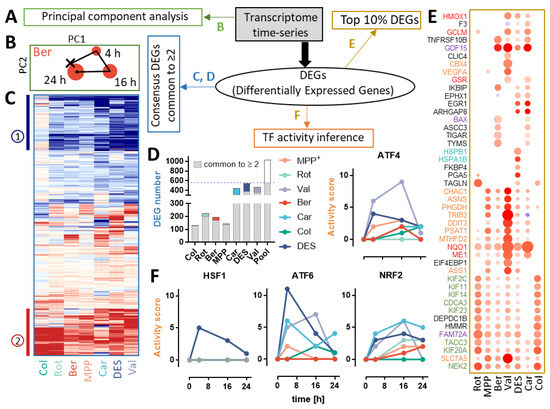 - Carta, G.; van der Stel, W.; Scuric, E.W.J.; Capinha, L.; Delp, J.; Bennekou, S.H.; Forsby, A.; Walker, P.; Leist, M.; van de Water, B.; et al. Transcriptional landscape of mitochondrial electron transport chain inhibition in renal cells. Cell Biol. Toxicol. 2023, 39, 3031–3059. [Google Scholar] [CrossRef] [PubMed]