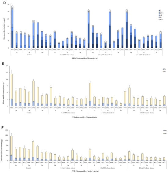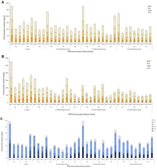 HPLC system connected to ELSD was used to identify and quantify various ginsenosides by comparing the retention times of the detected with those of the pure compounds. Twelve ginsenosides were detected and quantified using standards i.e., Rb1, Rc, Rb2, Rd, F2, Rg3-S, Rg3-R, C-K, Rk1, Rg1, Re and Rg5. The calibration curve of standards used is elaborated in Figure S1, and the TIC of control, aerial, and media treatment is given in Figure S2. The results of ginsenoside content in IR-treated silicate-supplemented hydroponic ginseng are shown in Figure 1. Elicitation of hydroponic media with IR light and sodium silicate both in media and spraying on the aerial part of the plant affects not only total ginsenoside content in all extraction conditions but also minor ginsenoside content were also significantly improved. Sodium silicate is known to enhance secondary metabolite production in plants through various mechanisms, including improved nutrient uptake and stress response [35]. Sodium silicate had a dramatic effect when added to hydroponic media alongside IR exposure. IR appears to function as an elicitor, prompting ginseng plants to enhance ginsenoside production. This response can be interpreted as a defense mechanism, as plants often increase the synthesis of secondary metabolites in response to environmental stressors [36]. Sodium silicate effectively improved ginsenoside content when elicitation was near the root zone [37]. In media treatment, 1.0 mM treatment of sodium silicate extracted for 1 h at 40 °C showed maximum overall total ginsenoside content with a total ginsenoside content of 368.09 ± 13.52 mg/g followed by 0.5 mM and 2.0 mM sodium silicate treatments with ginsenoside content being 308.75 ± 22.4 and 289.03 ± 21.45 mg/g. The impact of IR treatment and application of sodium silicate as a supplement both in hydroponic media and aerial spraying on leaves shows a different concentration of protopanaxadiol (PPD) and protopanaxatriol (PPT) type ginsenosides, as shown in Figure 1. A total of 12 ginsenosides, including 10 PPD (Rb1, Rc, Rb2, Rd, F2, Rg3-S, Rg3-R, C-K, Rk1, and Rg5) type and 2 PPT (Rg1, Re) type ginsenosides in extract from treated plants, were quantified by comparison of retention time using standards. PPD ginsenosides include four major ginsenosides and six minor ginsenosides based on quantity. Ginsenoside Rb1 showed sensitivity against the extraction temperature in both aerial and media treatment. The lower extraction temperature showed a higher content of Rb1, and at 1 h 40 °C extraction point a higher Rb1 content was observed in the control treatment (48.403 ± 3.53 mg/g) followed by a 1.0 mM sodium silicate treatment extracted (36.76 ± 2.41 mg/g). These findings align with previous studies on ginsenoside biosynthesis, which show that the regulation of specific ginsenoside types can be influenced by external factors [38]. Rd ginsenoside was found to be the most abundant in media supplementation treatment of sodium silicate, whereas ginsenoside Rb2 was overall higher in aerial spray treatment. Ginsenoside Rc contents were getting significantly higher with an increase in concentration of sodium silicate treatment, with a 1.0 mM sodium silicate treatment being the most effective treatment. Higher extraction time and temperature have a negative impact on Rc content. Figure 1B,E represents the content of individual minor ginsenosides in both aerial and media treatments. The content of ginsenoside F2 was reported to be positively correlated to the sodium silicate treatment followed by the extraction condition. The most effective was a 1.0 mM sodium silicate treatment in terms of ginsenoside F2 content. The content of ginsenoside Rg3-S was inversely proportional to sodium silicate treatment, whereas Rg3-R showed an opposite trend in media-supplemented treatment. C-K was the most abundant minor ginsenoside in media treatment. This is consistent with research that indicates ginsenoside transformation and bioconversion can be temperature-dependent processes [39]. Aerial spraying treatment of sodium silicate expressed the same response of ginsenoside F2 as in media treatment, suggesting that the sodium silicate treatment helps to upregulate factors that are responsible for the conversion of ginsenoside Rd to F2. This is supported by the observed increase in ginsenoside F2 content with sodium silicate treatment, as F2 is a product of the bioconversion of Rd [40]. In aerial treatment, ginsenoside Rg3-S was the most abundant ginsenoside, followed by C-K. Of the two isomers, i.e., Rg3-S and Rg3-R, one was predominant in media treatment i.e., ginsenoside Rg3-R, whereas Rg3-S was significantly higher in aerial treatment. Ginsenosides Rg5 and Rk1 were higher in media treatment but not significantly different than content in aerial treatment. When it comes to the overall composition of ginsenosides, maximum diversity was observed at a 40 °C extraction temperature, and higher contents were detected when extracted for higher temperature conditions. This highlights the influence of cultivation methods on ginsenoside composition, especially for elicitation [41]. Among PPT-type ginsenoside (Figure 1C,F), both aerial and media supplementation treatment showed higher content of ginsenoside Re in the control treatment, in which there was no significant impact of the sodium silicate treatment on PPT-type ginsenosides, suggesting that sodium silicate affects mostly pathways linked to PPD type ginsenoside bioconversion. PPT-type ginsenosides are sensitive to extraction temperature conditions as there was a significant drop in content when extraction, the temperature and duration were increased. The extraction yield was positively correlated to extraction duration and time. This emphasizes the need to carefully control extraction conditions to preserve PPT-type ginsenosides [42]. There was no significant difference in the extraction yield of the sodium silicate treatment when compared