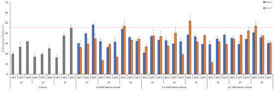 Monophenolase activity is responsible for the oxidation of monophenols to o-diphenols. This activity is critical for melanin synthesis, the pigment responsible for skin, hair, and eye color. Inhibition of monophenolase activity can have therapeutic potential in conditions characterized by excessive melanin production, such as hyperpigmentation disorders (e.g., melasma) and certain types of freckles. By inhibiting this activity, it is possible to reduce melanin production and subsequently lighten skin tone [53]. The influence of sodium silicate supplementation with IR treatment on the anti-tyrosinase potential of Panax ginseng was investigated using 2 mM L-Tyrosine as the substrate. The results demonstrated a dose-dependent inhibition of melanogenesis, as depicted in Figure 5. Particularly, the treatment with 1.0 mM sodium silicate led to the rapid conversion of mono-phenols to o-diphenolase after 1 h of extraction time at 40 °C in the media. The effectiveness of sodium silicate can be explained by the fact that tyrosinase needs to be converted to oxy form after passing a lag time phase, during which the met form of tyrosinase only converts o-diphenols into o-quinones [54]. Moreover, when the extraction process involved sodium silicate at a concentration of 1.0 mM and was conducted for 1 h at 60 °C, it exhibited the highest level of inhibition in the samples subjected to aerial treatment. The trend in media supplementation was not significantly different among the different concentrations of the sodium silicate treatment at various extraction time points. Meanwhile, in the control treatment, increasing extraction duration inversely influences the inhibition potential both in media and aerial treatments. The decrease in inhibition potential of control samples can be attributed to a reduction in flavonoid contents with an increase in extraction duration, which has been previously reported [55]. In aerial treatment, a higher extraction temperature was more effective against the inhibition of monophenolase enzyme when compared to other extraction temperatures and controls. Aerial treatment tends to have a higher content of ginsenoside Re and minor ginsenoside Rg3-S at higher extraction temperature points which are previously reported to have higher anti-tyrosinase potential [56,57]. Sodium silicate treatment improved monophenolase activity compared to control 8.6-fold in media, whereas it was an 8.89-fold improvement in aerial treatment. Overall, control treatment showed significantly lower inhibition activity compared to the sodium silicate treatment and the sodium silicate 1.0 mM concentration performed best among the other concentrations.