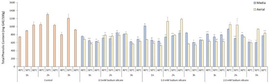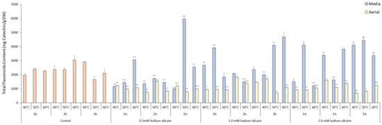 The TPC levels in both the media- and the foliage-sprayed treatments showed a negative correlation with the application of sodium silicate, compared to the control (Figure 3). The presence of silicate either by uptake via stomata or by hair roots in the media system has a negative impact on the biosynthesis of phenolic compounds, which may be attributed to higher osmotic potential generating a slight salinity condition resulting in a decrease in total phenolic content [44]. The control treatment exhibited the highest amount of phenolics at 2 h and 50 °C, measuring 1304.02 ± 36.84 mg GAE/100 g, followed by the control treatment at 3 h and 50 °C, which measured 1208.90 ± 100.35 mg GAE/100 g. The duration of extraction and temperature had a significantly positive effect on the phenolics content, with the optimal conditions being 2 h for extraction time and 50 °C for temperature in control. The total phenol content (TPC) yield demonstrated an initial increase with rising extraction temperature and prolonged extraction time. However, this positive trend was followed by a subsequent decrease in TPC yield. This phenomenon can be attributed to the breakdown of the plant cell wall, facilitated by water’s role as a swelling agent, leading to enhanced extraction of phenolic compounds. The solvent ethanol aids in dissolving the polyphenols by disrupting the solid–solvent contact area, further enhancing the extraction process [45]. Ultrasonication has shown similar results when investigated against conventional extraction methods in food processing [46]. There were slight variations in content between the aerial and media application of sodium silicate within the treatments. Sodium silicate 1.0 mM, 2 h 60 °C in aerial showed the best results, whereas sodium silicate 1.0 mM 1 h 40 °C was the best for media treatment in sodium silicate-treated extracts with the content of 1183.52 ± 23.02 and 1017.42 ± 4.605 mg GAE/100 g, respectively. It was previously reported that the sodium silicate treatment enhances the total phenolic content when treated with Fe-EDTA and sodium [47,48]. Overall, phenolic content remained stable across different temperatures and time points. On the other hand, the total flavonoid content increased proportionally with extraction time in the media treatment, with the highest content observed in the sodium silicate 0.5 mM, 3 h, and 50 °C treatment, measuring 5966.27 ± 43.89 mg catechin/g DW (Figure 4). In aerial spraying, the control treatment with 2 h and 60 °C extraction condition showed the best result for total flavonoid content with 3045.39 ± 307.24 mg catechin/g DW. Total flavonoid contents tend to increase with an increase in time for extraction due to a decrease in the viscidity of solvent with an increase in temperature, resulting in the release of bioactive compounds from plant cells. Increasing the temperature higher than the optimum extraction point specific for each plant material results in a decrease in total flavonoid contents [49].