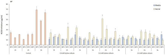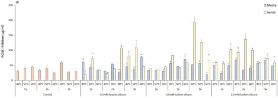 In this study, the inhibitory effect of sodium silicate on the diphenolase activity of mushroom tyrosinase for the oxidation of L-DOPA was investigated (Figure 6). Diphenolase inhibitors work by inhibiting the diphenolase activity of tyrosinase. It chelates copper at the active site of the enzyme and competes with the substrate for the active site, thereby inhibiting the enzyme activity [58]. For media treatment, the best inhibition was shown by the sodium silicate treatment of 1.0 mM concentration extracted for 3 h at 60 °C, which was the highest extraction time and temperature points for our experiment, consistent with previous research on enzyme inhibition [59]. However, for aerial treatment, the best treatment was shown at the right opposite extraction conditions with the sodium silicate treatment of 0.5 mM and 1 h 40 °C setup. Our results showed that the sodium silicate treatment improved the inhibition activity 2.90- and 2.88-fold better compared to the control treatment in media and aerial treatment, respectively. The inhibition strength follows the order: 1 h 40 °C aerial 0.5 mM > 2 h 40 °C aerial 0.5 mM 3 h 60 °C media 1.0 mM > 1 h 50 °C media 2.0 mM. In the media treatment, 1 and 2 h extraction time points at 40 °C lower concentrations of sodium silicate were more effective; and at 50 °C, the highest concentration of 2.0 mM was performing better within the treatments. These results are consistent with previous literature on the sensitivity of enzyme inhibition to factors such as temperature and concentration [60]. In control treatment compared to sodium silicate, 2–3 h extraction duration tends to perform better inhibition activity of tyrosinase enzyme. In the case of the aerial treatment of sodium silicate, a 3 h extraction time decreased the inhibitory effect on the diphenolase activity. In 1 and 2 h extracted samples, lower concentrations of sodium silicate worked better than the control treatment. Three h of extraction time gave a better inhibition percentage without the sodium silicate treatment and affected the inhibition potential of the sodium silicate-treated samples. It can be concluded from the results that the inhibition potential of the sodium silicate treatment on the diphenolase activity of the enzyme is sensitive to sodium silicate concentrations, and when supplemented in hydroponic media, it gives good results when compared to aerial spray treatment. Ref. [61] reported that P. ginseng leaf-capped gold nanoparticles exhibit good inhibitory potential against the diphenolase enzyme and [62] reported that minor ginsenoside plays an important role in the inhibition of the tyrosinase enzyme-related pathway.