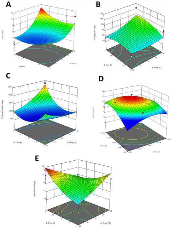 As per Table 4, the p values of the lack of fit indicate that the variables analyzed were sufficient to explain the proposed model. R2 values of antioxidant, TPC, TFC, anti-tyrosinase, and extraction yield were 0.99, 0.95, 0.96, 0.93, 0.89, and 0.91, respectively, the lower values of statistical parameters for the responses, confirming the desirability of the generated model. All five responses exhibited a nonsignificant lack of fit, with values of 7.38, 34.39, 70.13, 1.33, and 0.56, respectively, indicating that the models fit the data well. Thus, the model was appropriate for predicting the best extraction conditions within the tested range.