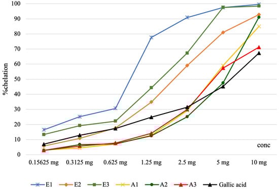 Principle of the Method: Fe2+ forms a pink-colored complex with ferrozine, exhibiting maximum absorbance at 562 nm. The presence of a chelating agent in the reaction medium results in reduced absorbance of the formed complex, leading to a decrease in the solution’s color intensity [20,21]. The list of the reagents used for this procedure included: