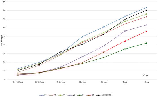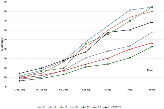 These results could be explained by the fact that the retrieval of antioxidant compounds from botanical sources typically involves employing various extraction methodologies tailored to their inherent chemistry and non-uniform distribution within the plant matrix. Among these methods, solvent extraction stands out as the most commonly utilized technique for the isolation of antioxidant compounds from plants [37].