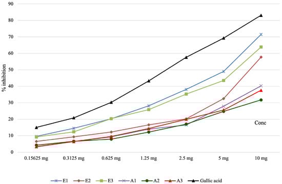 Gallic acid was used as a reference substance, and gallic acid solutions in DMSO were processed under the same conditions as the ethanolic extract. All determinations were performed in triplicate, and the results are expressed as the mean of three determinations ± standard deviation.