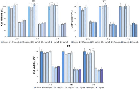 A431 viability (%) in contact with E1–E3 Perilla frutescens extracts. Each value represents the mean ± standard error mean (n = 3). * p < 0.01, ** p < 0.001, *** p < 0.0001 versus control (analyzed by means of two-way ANOVA).