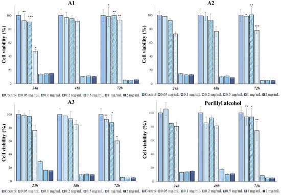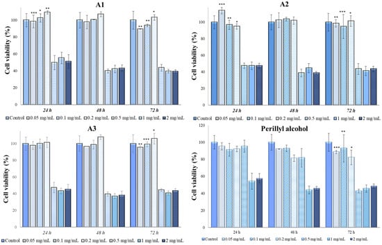 A431 viability (%) in contact with A1–A3 Perilla frutescens extracts and perillyl alcohol. Each value represents the mean ± standard error mean (n = 3). * p < 0.01, ** p < 0.001, *** p < 0.0001 versus control (analyzed by means of two-way ANOVA).