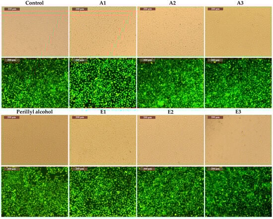 In the figures below, it can be observed that all the data obtained for the Calcein AM assay are correlated with the data obtained in the MTT test. Thus, for the MG-63 cell line, in the case of extracts E1–E3 and A1–A3, where viability values ranged from 101% to 106%, a cell density similar to that in the control wells is observed. However, in the case of perillyl alcohol, where the viability was 82%, there are areas that are not populated with cells (Figure 9).