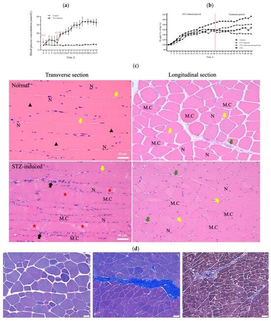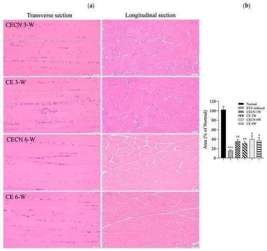 30]. Consistent with the findings of previous studies, in the present study, increased collagen deposition was observed between the muscle fibers of STZ-induced diabetic rats, as was the aggregation of muscle cells and inflammatory cells located between muscle. These changes are associated with muscle atrophy and a decrease in grip strength, as evidenced by the narrowed perimysium and endomysium space between muscle fibers in this study. Importantly, after treatment with CE and CECNs, both the area of the perimysium and endomysium between muscle fibers and the area of muscle fibers (size) had significantly increased, indicating the amelioration of muscle atrophy. Furthermore, the significant recovery of grip strength to more than 80% of that of the healthy control rats indicated the partial recovery of muscle function (