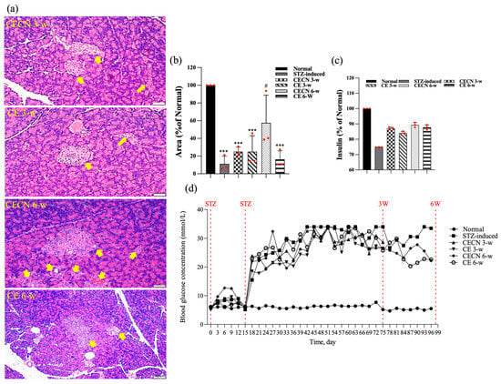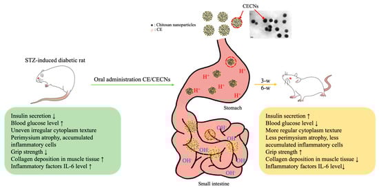 Figure 9, the abnormal pathological conditions originated in STZ-induced diabetic rats, such as shrank pancreatic islet and decreases in the number and size of pancreatic islet in the pancreas, were ameliorated by oral administration of CE and CECNs. Furthermore, serum insulin secretion was slightly increased, and blood glucose levels were lowered under the action of increased insulin levels. These findings indicated that CE and CECNs exerted a reparative effect on the pancreas in the STZ-induced diabetic rats.