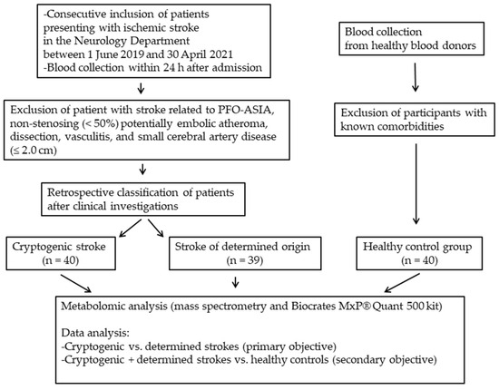 Two groups of control subjects were recruited. Blood samples were taken under the same pre-analytical conditions as for the subjects who had suffered a cryptogenic stroke. The first group of control subjects consisted of 39 subjects with ischemic stroke of determined cause, who were monitored in the same Neurology Department. The second group of control subjects consisted of 40 healthy subjects recruited from among blood donors. All participants with clearly identified comorbidities, such as diabetes, dyslipidemia, hypertension, cardiovascular and metabolic diseases, and cancer, were excluded from this healthy control group.