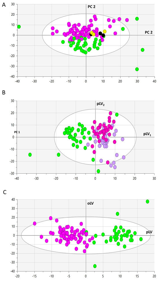 Principal component analysis (PCA) and orthogonal projection to latent structures discriminant analysis (OPLS-DA) scatter plot with samples represented as circles. (A) The first plan of the principal component analysis including samples from controls (green), stroke (violet), and pool samples. Pool samples analyzed in the first batch are colored in yellow and those analyzed in the second batch are colored in black. There is a neat distinction between samples from controls and stroke patients in the second principal component (PC2) whilst pool samples plot near the origin (0,0) with no clear batch effect. (B) OPLS-DA analysis of all samples aiming at discriminating between controls (green), cryptogenic strokes (light violet), and strokes of known origin (dark violet), which are considered as three different groups. This model had no good predictive capabilities mainly due to the lack of discrimination between cryptogenic strokes and strokes of a known etiology. (C) However, as expected from the PCA analysis, there is a clear distinction between control (green circles) and stroke (dark violet circles)samples taken as a single group. OPLS-DA scatter plot PCA and OPLS-DA axes are dimensionless. Legend: PC1, PC2: first and second principal components; pLV1, pLV2: first and second predictive latent variables; pLV: predictive latent variable; oLV: orthogonal latent variable.
