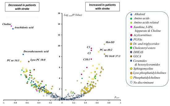 Volcano plot combining uni- and multivariate analyses. The x-axis represents loadings from the OPLS-DA analysis discriminating between control and stroke patients, with positive/negative values indicating relatively elevated/diminished concentration in the plasma of stroke patients compared to that of controls. Log-transformed p-values obtained from the comparison between both groups form the y-axis, using 0.05 as the base for logarithm calculation. Only metabolites that retained their significance after the Benjamini–Hochberg correction are displayed as colored circles. Some significant metabolites are also labeled due to very low (i.e., very significant) p-values and were positively correlated (methionine sulfoxide (Met-SO), acetyl (C2), propionyl (C3) and oleoyl (C18:1) carnitines, diacyl phosphatidylcholine PC aa 40:2, and triacylglyceride TG 16:0/37:3) or negatively correlated (choline, arachidonic acid, docosahexaenoic acid, lysophosphatidylcholine 18:0, and acyl-alkyl phosphatidylcholine PC ae 34:3) with the predictive latent variable. Legend: Pcorr: loading of each metabolite on the predictive latent variable represented as a correlation coefficient; 3-IPA: 3-indolepropionic acid; PUFAs: polyunsaturated fatty acids as acyl moieties in phosphatidylcholine species; DHEAS: dehydroepiandrosterone sulfate; GLCA: glycolithocholic acid.