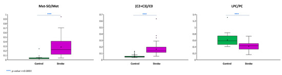 Three ratios: (1) methionine sulfoxide over methionine (Met-SO/Met); (2) the sum of the two most abundant short-chain acylcarnitines acetyl and propionyl carnitines over free carnitine ((C2 + C3)/C0); and (3) the sum of all lysophosphatidylcholine over the sum of all phosphatidylcholines (Lyso-PC/PC), differed significantly between control and stroke patients (Figure 4).