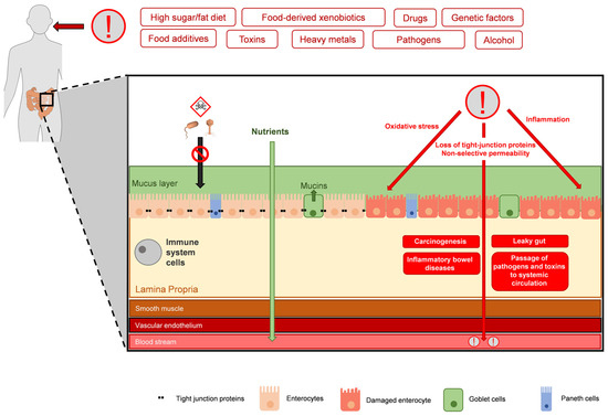 The relevance of the factors mentioned above is related to oxidative damage and inflammation in the gut. Considering only internal barriers, the gastrointestinal tract exposure to pathogens and xenobiotic molecules is unmatched [14]. Here, the selective permeability of the intestinal barrier, allowing nutrient and water uptake, but limiting the assess of pathogens and xenobiotics to the systemic circulation, is essential [15]. Its outer layer, the intestinal mucosa, the largest mucosal surface in the human body, presents a contiguous monolayer of columnar epithelial cells. This mucosa is divided into the small and large intestines; the first is still divided into three sections (duodenum, jejunum, and ileum), while the large intestine comprises the cecum, colon, rectum, and anal canal [16,17,18]. The epithelium differs between the two main portions, as the small intestine presents villi and a folded epithelium designed to maximize the area surface and increase nutrient uptake, with crypts (cavities within the folds) and villi (projections of the epithelial cells to increase surface area and specialized in nutrients metabolization and absorption). In the crypts, stem cells can be found, assuring mucosa renewal, proceeding to immature cells and then mature epithelial cells, such as enterocytes, goblet cells, Paneth cells, M (microfold) cells, or enteroendocrine cells [18,19]. It is estimated that the small intestinal epithelium renews every 3–5 days. The large intestine differs in the percentage of each type of cells and lacks the villi [18,19]. Adding to the physical barrier, the intestinal tract also presents a mucus layer (produced by goblet cells), glycocalyx (meshwork formed by the carbohydrate moiety of cell surface glycoproteins), and tight-junction proteins, as well as a chemical barrier with antimicrobial peptides produced by Paneth cells [20,21,22]. This mucosa is kept under a tightly controlled homeostasis and, as a barrier, responds to pathogenic microorganisms and their metabolites, but also to commensal bacteria, food components, and other xenobiotics [23].