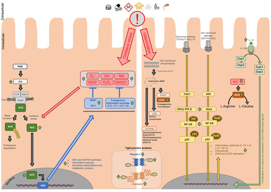 Most important is the notion that some dietary components (e.g., fruits, vegetables, and aromatic and medicinal plants) present antioxidant and anti-inflammatory activities and are known to reverse leaky gut syndrome and restore barrier homeostasis [24,32]. The intestinal tract is the potential point of entry for hazardous elements that compromise the barrier function and subsequently affect internal organs, but its main function is nutrient uptake, and many sources of nutrients are also sources of phytochemicals. The proposed strategy is to add antioxidant and anti-inflammatory natural products to the diet as functional foods and nutraceuticals, aiming for the maintenance of intestinal mucosa homeostasis and the prevention of oxidative damage, inflammation, and related pathologies [33]. In this review, we summarize and discuss the potential impact of certain natural products as dietary agents with the potential to regulate intestinal homeostasis and prevent oxidative stress- and inflammation-related intestinal pathologies. Figure 1 summarizes the main risk factors for increased oxidative stress and inflammation in the intestinal tract.