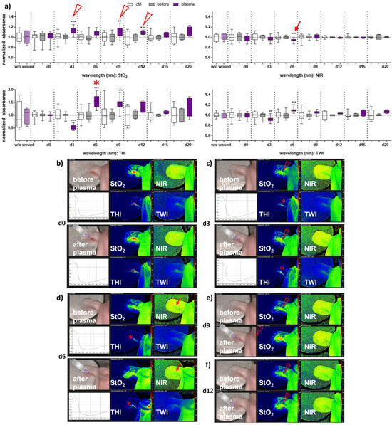 Gas plasma treatment altered microcirculatory parameters during wound healing in females. (a) Quantification of hyperspectral imaging parameters of ear wounds exposed to gas plasma, including tissue oxygenation (StO2), tissue hemoglobin index (THI), perfusion in deeper layers (NIR), as well as the tissue water index (TWI). Apparent changes of StO2 (arrowhead), THI (star), and NIR (arrow) are indicated. (b–e) Representative false-colored images of murine ear wounds exposed to gas plasma for 10 s before (upper panels) and after treatment (lower panels) in females on d0 (b), d3 (c), d6 (d), d9 (e), and d12 (f). Results are expressed as boxplots ± SEM of at least six independent measurements, and statistical analysis was performed using one-way analysis of variances with ** p < 0.01 and *** p < 0.001.