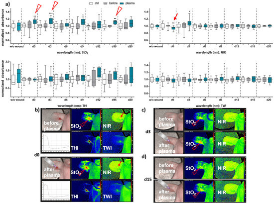 To analyze the tissue microcirculatory characteristics in real-time, the HSI camera system TIVITA Tissue (Diaspective Vision, Am Salzhaff, Germany) was utilized as previously described [13]. Then, the light of the visible and invisible spectrum (500–1000 nm) is analyzed, attributing sub-spectra to distinct parameters, such as oxygen saturation (StO2) in superficial layers and the perfusion into deeper skin regions (near-infrared index, NIR; 4–6 mm). In addition, the software can analyze the hemoglobin distribution using a tissue hemoglobin index (THI) and the water content using a tissue water index (TWI). Hyperspectral images were acquired under standardized conditions with a distance from the camera to the ear of 50 cm. After wounding, HSI parameters were immediately (within 10 min) recorded after gas plasma treatment and compared to that of untreated control wounds (set to 1). This was repeated every third day up to the endpoint (d20) in control or gas plasma-treated wounds (again, within 10 min post-exposure). For data analysis, the camera-specific software TIVITA Suite 1.0 (Diaspective Vision, Am Salzhaff, Germany) was used to calculate all parameters in well-defined circular wound regions (n > 4).