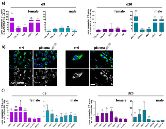 Collagen type I alpha 1 (COL1A1), collagen type III alpha 1 (COL3A1), and decorin (DCN), a small leucine-rich proteoglycan, are major extracellular matrix (ECM) components of dermal skin tissue. Data from females and males displayed a significant effect on collagen 1 expression compared to collagen 3 levels. COL1A1 expression in females was higher on day 9 but decreased on d20 in contrast to males, where the effect was the opposite. No significant differences were found between all groups regarding COL3A1 gene expression. Decorin functions in collagen fibrillogenesis and was significantly upregulated after gas plasma exposure in males compared to a slight increase in females. Next, we quantified the expression of smooth muscle actin α (αSMA) and fibronectin 1 (FN1), which were strongly upregulated with gas plasma treatment on both time points, except for FN1 in males on d9. Interestingly, females (left diagrams) responded earlier with an upregulation of ECM targets on d9 compared to males (right diagrams) in which these targets were strongly upregulated on d20, affirming gender-specific differences in the expression of ECM-associated targets (Figure 5a). To show the gas plasma effects on collagens in vitro, skin cells of untreated and gas plasma-treated SKH1-STZ mice were isolated, cultivated, and fluorescently stained for collagen I, validating the in vivo results. In vivo pre-treated cells showed stronger staining than non-treated skin cells, which was once again stronger than in untreated controls (Figure 5b). ECM remodeling is essential in forming new blood vessels from pre-existing ones. Fibroblasts produce matrix metalloproteinases (MMPs), a group of enzymes involved in the breakdown of ECM components during wound healing. MMPs (MMP2, 8 (collagenase 2), 9 (gelatinase B), 10 (stromelysin 2), 14) were differentially regulated, including partial differences between genders. MMP2 and MMP8 were mainly upregulated except for males on d9, but their overall relative expression was up to 5 times higher on d9 in gas plasma-treated animals. MMP8 is primarily associated with acute inflammatory processes, underlining its lower expression on d20. MMPs 9, 10, and 14 were partly upregulated in males on d9, suggesting transient degradation regulation and remodeling of the ECM components following gas plasma treatment. Additionally, tissue inhibitors of MMPs, TIMP1 and 2, were upregulated at all time points in both genders (Figure 5c,d).