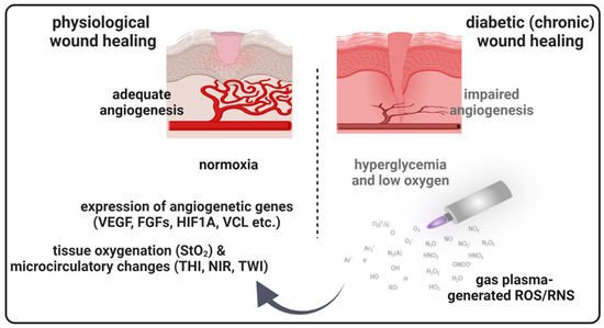 Schematic overview of gas plasma-induced effects on the microcirculatory system and angiogenic gene expression in diabetic wound healing. Due to a postponed, incomplete, or uncoordinated healing process, diabetic wounds are characterized by a persistent inflammatory phase associated with an impediment in the formation of mature granulation tissue and vascular damage resulting in low oxygen content and obstruction of wound closure. Gas plasma-generated reactive oxygen species (ROS) support diabetic wound closure due to the promotion of pro-angiogenic gene transcription and stimulating microvascular parameters like the oxygenation of superficial skin tissue (StO2) to support angiogenesis in diabetic wound models. THI, tissue hemoglobin index; NIR, near-infrared index; TWI, tissue water index.