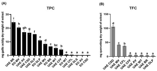 Determination of (A) total phenolic content (TPC) and (B) total flavonoid content (TFC) values of all tested samples. Hexane extract: ultrasound-assisted extraction (UAE); essential oils (EOs); B. rotunda (BR); C. sinensis (CSD); C. fistula leaves (CFL); C. fistula pods (CFF); M. villosa leaves (MV); D. longan peels (DLP); D. longan seeds (DLS); W. trilobata leaves (WT); and A. vulgaris (AV). Note: The TFC values of UAE DLS and all EOs were not determined because they were inactive at the highest tested concentration (5 mg/mL). One-way ANOVA was performed to compare the mean of each sample in each assay, and different letters indicate the significant difference of the mean.