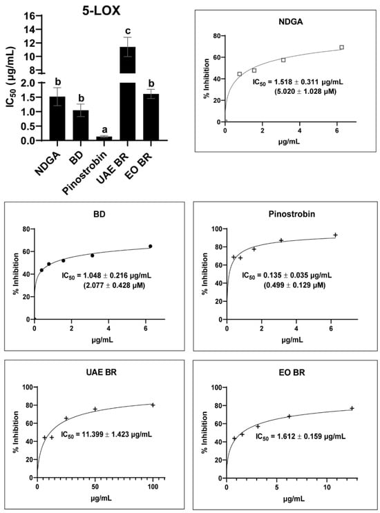 5-LOX inhibitory activity of B. rotunda hexane extract (UAE BR), essential oils (EOs BR), and pinostrobin compared to standard nordihydroguaiaretic acid (NDGA) and corticosteroid betamethasone dipropionate (BD). One-way ANOVA was performed to compare the mean of each sample in each assay, and different letters indicate the significant difference in the mean.