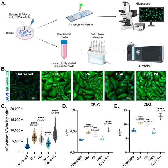 Figure 1. MG adducts are produced intracellularly and secreted by endothelial cells under diabetogenic conditions. (A) Design schematic and pipeline. Created with BioRender.com. (B) Immunofluorescent analysis of intracellular MG adducts in HUVECs exposed to 25 mM Glu, 100 µM PA, BSA, or 25 mM Glu + 100 µM PA. (C) Quantification of (B). N = 3; the data represent three independent biological replicates. A minimum of 300 cells per condition were analyzed. Statistical significance was determined via the one-way ANOVA with Dunnett’s multiple comparisons test. Extracellular, secreted levels of (D) CEdG and (E) CEG were quantified using LC-MS/MS with quantitation to isotopically labeled internal standards. N = 3; data represent three independent biological replicates. Statistical significance was determined via the one-way ANOVA with Dunnett’s multiple comparisons test.