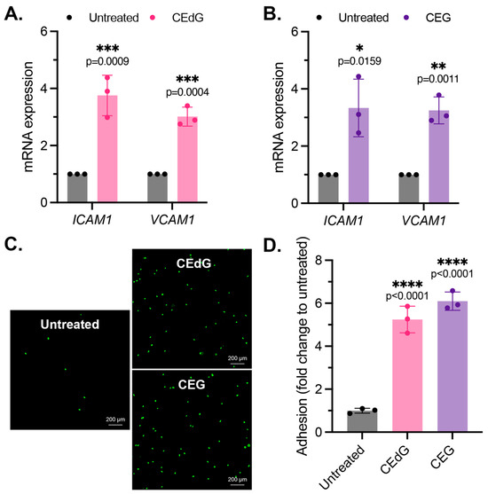 As by-products of dysregulated metabolism, we proposed that MG adducts may be a driver of vascular disease. An early precursor of vascular disease is endothelial dysfunction, which typically begins with endothelial activation, characterized by increased leukocyte diapedesis, in which immune cells, such as monocytes, migrate and extravasate into the endothelium where they recruit additional immune cells and can induce inflammation [44]. We began by studying two prominent surface adhesion markers that facilitate monocyte adhesion, ICAM1 and VCAM1. Treatment with CEdG led to an approximate 4-fold and 3-fold increase in the expression levels of ICAM1 and VCAM1, respectively (Figure 2A), while CEG led to an approximate 3-fold increase in the expression levels of both (Figure 2B). We next examined the impact of MG adducts on monocyte adhesion and found that the treatment of HUVECs with either CEdG or CEG significantly increased the adherence of THP-1 monocytes to a HUVEC monolayer (Figure 2C,D). The increase in ICAM1 and VCAM1 expression and monocyte adhesion were not observed when HUVECs were treated with the MG adducts’ unmodified nucleoside counterparts—deoxyguanosine (dG) or guanosine (G) (Figure S2A,B).