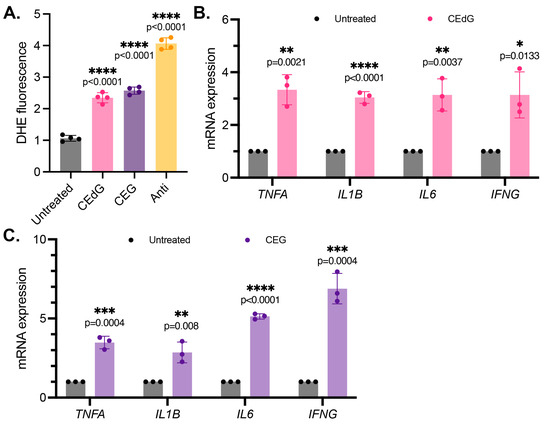 Figure 3. MG adducts upregulate ROS production and expression of pro-inflammatory cytokines in HUVECs. (A) ROS were detected via a dihydroxyethidium (DHE) probe in HUVECs treated with MG adducts. HUVECs were treated with 100 ng/mL of R,S-CEdG or CEG for 1 h. N = 4; the data represent four independent biological replicates with technical triplicates. Statistical significance was determined via the one-way ANOVA with Dunnett’s multiple comparisons test. (B,C) qPCR analysis of TNFA, IL1B, IL6, and IFNG in HUVECs treated with 100 ng/mL of R,S-CEdG or CEG for 1 h. N = 3; the data represent three independent biological replicates. Statistical significance was determined via the unpaired t-test.