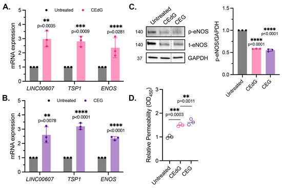 Figure 4. MG adducts induce endothelial dysfunction and impair endothelial homeostasis and barrier integrity. (A,B) qPCR analysis of LINC00607, TSP1, and ENOS in HUVECs treated with 100 ng/mL of R,S-CEdG or CEG for 1 h. N = 3. Statistical significance was determined via the unpaired t-test. (C) Western blot analysis for phosphorylated and total eNOS in HUVECs treated with 100 ng/mL of R,S-CEdG or CEG for 1 h. N = 3. Statistical significance was determined via the one-way ANOVA with Dunnett’s multiple comparisons test. (D) Endothelial permeability of HUVECs treated with 100 ng/mL of R,S-CEdG or CEG for 6 h. N = 3. Statistical significance was determined via the one-way ANOVA with Dunnett’s multiple comparison test.