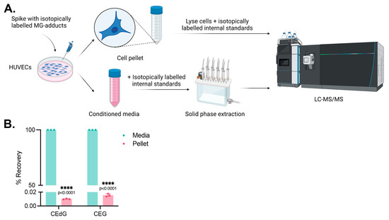 Figure 5. MG adducts are not taken up by HUVECs. (A) Design schematic and pipeline. Created with BioRender.com. (B) HUVECs were treated with 200 ng/mL isotopically labeled R,S-CEdG or CEG for 24 h. The conditioned media and cell pellet were harvested and processed, and the levels of MG adducts in each compartment were quantified via LC-MS/MS with quantitation to isotopically labeled internal standards. N = 3; the data represent three independent biological replicates. Statistical significance was determined via the unpaired t-test.