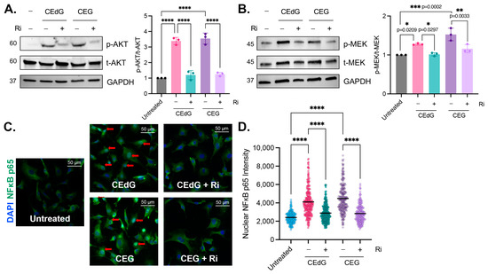 Figure 6. MG adducts activate RAGE signaling and promote NFκB p65 nuclear translocation. Western blot analysis of total and phosphorylated (A) AKT and (B) MEK. HUVECs were treated with 100 ng/mL of R,S-CEdG or CEG for 1 h, with or without 100 µM Ri pretreatment for 1 h. N = 3; the data represent three independent biological replicates. Statistical significance was determined via the one-way ANOVA with Tukey’s multiple comparisons test. **** p < 0.0001. (C) NFκB p65 nuclear translocation was measured via immunofluorescence and brightfield microscopy. HUVECs were treated with 100 ng/mL of R,S-CEdG or CEG for 1 h, with or without 100 µM Ri pretreatment for 1 h. (D) Quantification of (C). N = 3; the data represent three independent biological replicates. Statistical significance was determined via the one-way ANOVA with Tukey’s multiple comparisons test. **** p < 0.0001.