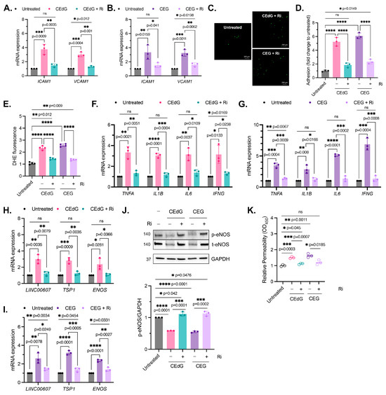 Figure 7. MG adduct-induced endothelial dysfunction is mediated through RAGE signaling. (A,B) qPCR analysis of ICAM1 and VCAM1 in HUVECs pre-treated with 100 µM Ri for 1 h, followed by 100 ng/mL of R,S-CEdG or CEG for 1 h. Statistical significance was determined via multiple unpaired t-tests. N = 3; the data represent three independent biological replicates. Untreated, CEdG-treated, and CEG-treated samples were run in tandem and are derived from Figure 2A,B, and are included here for the purpose of the comparison with RAGE inhibitor-treated samples. (C) Functional effects on endothelial activation were assessed via the monocyte adhesion assay. HUVECs were pre-treated with 100 µM Ri for 1 h, followed by 100 ng/mL of R,S-CEdG or CEG for 1 h. (D) Quantification of (C). N = 3; the data represent three independent biological replicates. Statistical significance was determined via the one-way ANOVA with Tukey’s multiple comparisons test. Untreated, CEdG-treated, and CEG-treated samples were run in tandem and are derived from Figure 2D, and are included here for the purpose of the comparison with RAGE inhibitor-treated samples. (E) ROS were detected via the dihydroxyethidium (DHE) probe in HUVECs pre-treated with 100 µM Ri for 1 h, followed by 100 ng/mL of R,S-CEdG or CEG for 1 h. N = 4; the data represent four independent biological replicates with technical triplicates. Statistical significance was determined via the one-way ANOVA with Tukey’s multiple comparisons test. Untreated, CEdG-treated, and CEG-treated samples were run in tandem and are derived from Figure 3A, and are included here for the purpose of the comparison with RAGE inhibitor-treated samples. qPCR analysis of (F,G) TNFA, IL1B, IL6, and IFNG, (H,I) ENOS, LINC00607, and TSP1 in HUVECs pre-treated with 100 µM Ri for 1 h, followed by 100 ng/mL of R,S-CEdG or CEG for 1 h. N = 3; the data represent three independent biological replicates. Statistical significance was determined via multiple unpaired t-tests. Untreated, CEdG-treated, and CEG-treated samples were run in tandem and are derived from Figure 3B,C and Figure 4A,B, and are included here for the purpose of the comparison with RAGE inhibitor-treated samples. (J) Western blot analysis for phosphorylated and total eNOS in HUVECs pre-treated with 100 µM Ri for 1 h, followed by 100 ng/mL of R,S-CEdG or CEG for 1 h. N = 3. Statistical significance was determined via the one-way ANOVA with Tukey’s multiple comparisons test. Untreated, CEdG-treated, and CEG-treated samples were run in tandem and are derived from Figure 4C, and are included here for the purpose of the comparison with RAGE inhibitor-treated samples. (K) Endothelial permeability of HUVECs treated with 100 ng/mL of R,S-CEdG, or CEG for 6 h, with or without pre-treatment of 100 µM Ri for 1 h. N = 3. Statistical significance was determined via the one-way ANOVA with Tukey’s multiple comparison test. Untreated, CEdG-treated, and CEG-treated samples were run in tandem and are derived from Figure 4D, and are included here for the purpose of the comparison with RAGE inhibitor-treated samples. **** p < 0.0001.