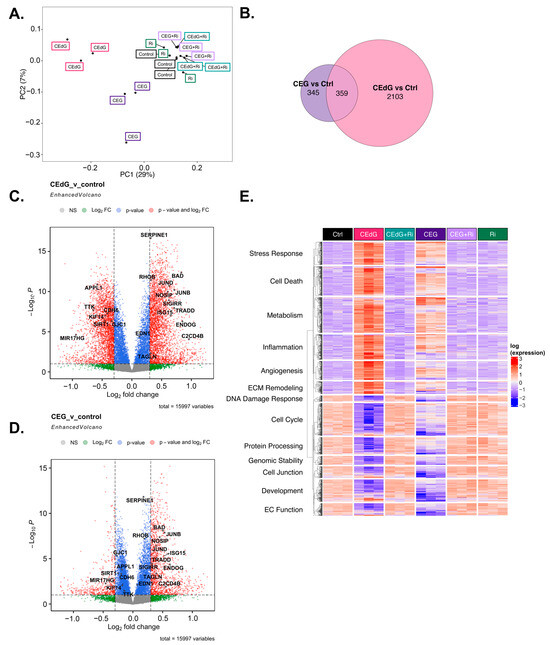 To understand the transcriptomic-wide effects of MG adducts on HUVECs in relation to endothelial function and biology, we performed RNA sequencing on cells treated with vehicle or either MG adducts with or without Ri. Principal component analysis (PCA) revealed that triplicate samples showed similar clustering and a clear discrimination between groups treated with either MG adducts without Ri (“CEdG” or “CEG”), untreated samples (“Control”), those that were treated with both MG adducts and Ri (“CEdG+Ri” or “CEG+Ri”), or Ri alone (“Ri”). The eigenvalues of the first two principal components accounted for 36% of the total variance (Dim1: 7%; Dim2: 29%) (Figure 8A). The analysis of the differentially expressed genes (DEGs) differentially impacted by CEdG or CEG or shared differences revealed that with a threshold of p < 0.1 and log2FC of ±0.5, 345 genes were unique to CEG, 2103 genes were unique to CEdG, and 359 genes were differentially expressed between the groups (Figure 8B).