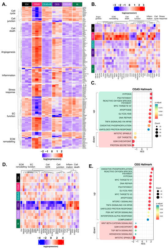 Figure 9. Unique and common changes in gene and pathway expression in HUVECs treated with MG adducts. (A) Annotated heatmap highlighting the genes involved in the cell cycle, cell death, cell junction, angiogenesis, inflammation, stress responses, EC function, and ECM remodeling, and their change in expression in response to exposure to either CEdG or CEG, with or without Ri pre-treatment. Common DEGs that are significant (p.adj < 0.1) in both CEdG and CEG are shown. (B) DEGs uniquely differently regulated by treatment with CEdG. (C) Hallmark pathway analysis for HUVECs treated with 100 ng/mL of R,S-CEdG for 1 h. (D) DEGs uniquely differently regulated by treatment with CEG. (E) Hallmark pathway analysis for HUVECs treated with 100 ng/mL of R,S-CEG for 1 h.