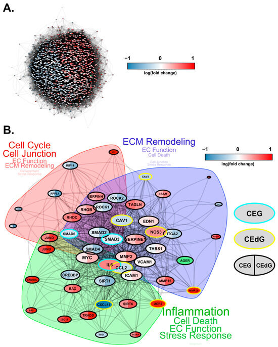 Finally, we conducted protein–protein interaction network analyses to study how these DEGs interact at the protein level. Based on known protein–protein interactions (PPIs) from the STRING database, we constructed an interaction network consisting of all the DEGs (1001 genes in total) that were involved in key biological processes relevant to RAGE-dependent signaling in either CEdG- or CEG-treated HUVECs (Figure 10A). We found that these genes form a strongly interconnected PPI network (p = 0), suggesting that changes in these PPIs will cause a coordinated change in the cellular phenotype. Furthermore, large fractions of upregulated and downregulated genes clustered separately in this network (indicated by the blue and red genes in Figure 10A), forming their own separate subnetworks. This suggests a coordinated regulation of the upregulated and downregulated biological processes through separate PPI networks.