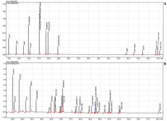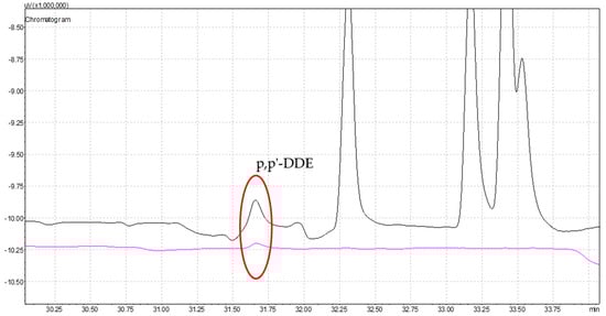 For the analysis of the OCPs, PYRs, PCBs, and BDEs, a Shimadzu GC-2010 with an ECD (Electron Capture Detector) apparatus was equipped with a Zebron 5MSi capillary column of 30.0 m (0.25 µm film thickness, 0.25 mm inner diameter, Phenomenex, Torrance, CA, USA). Injections of 1 μL were made in splitless mode, and its port temperature was 250 °C. The temperature started at 40 °C and was held for 1 min, followed by increases of 15 °C/min to 120 °C (held for 1 min), then 10 °C/min to 150 °C (held for 1 min), then 5 °C/min to 180 °C (held for 1 min), then 5 °C/min to 200 °C (held for 1 min), and finally 5 °C/min to 290 °C (held for 21 min). The ECD temperature was 300 °C. As a carrier gas, helium was used at a constant flow rate of 1.00 mL/min. The system was operated by GCsolution software (version 2.42.00, Shimadzu Corporation, Kyoto, Japan).