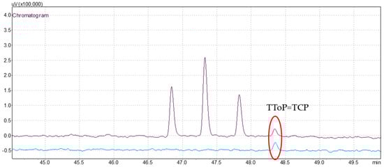 The contaminants screening of A. unedo berry extracts utilized a 500 mg C18-E column, following the procedure described in [], with minor modification. Initially, 10 mg of extract was diluted in 1 mL of ultrapure water and vortex-mixed for 1 min. Then, the column was conditioned in the manifold, and the solvents (of dichloromethane:ethyl acetate (1:1), methanol, and ultrapure water) were conditioned (2 × 2 × 2) twice through the column. Next, 1 mL of the sample was filtered through the column and followed by 6 mL of ultrapure water. After drying the cartridge for 20 min, the sample was eluted with 1 mL of dichloromethane: ethyl acetate (1:1). The extracted solution was dried under nitrogen flow and then redissolved in n-hexane. A vial containing the solution was later inserted in the respective GC.