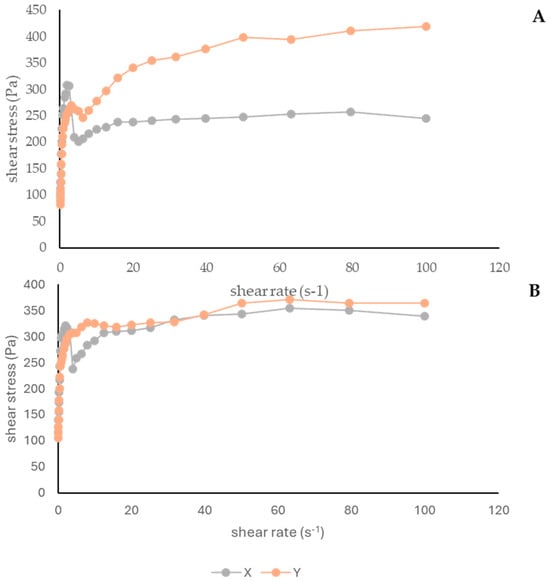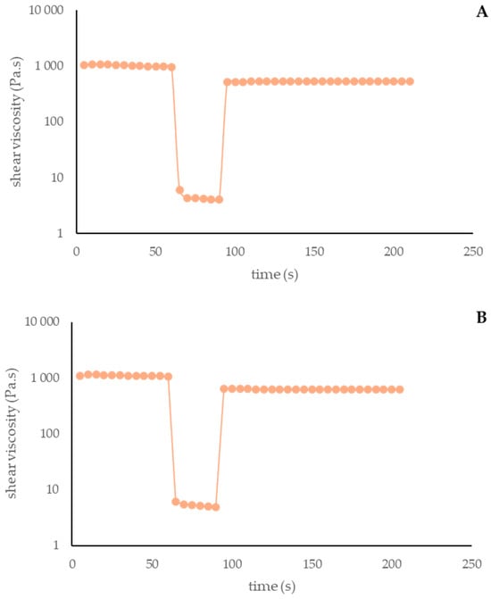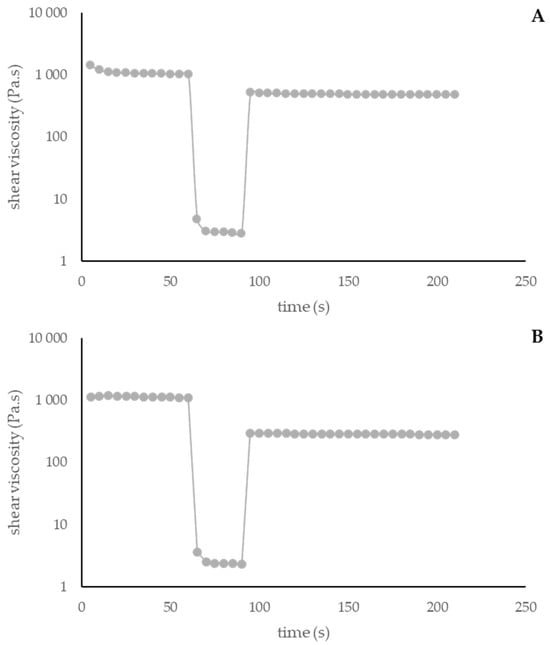 To evaluate the formulations’ thixotropy, a tree phase test was applied, with the following conditions. The operation started with a shear rate of 0.1 s−1 for 60 s, then the shear rate was increased up to 100 s−1 for 30 s, and finally, the shear rate was reduced for 120 s to 0.1 s−1.