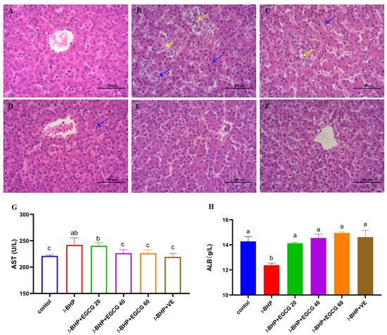 Effect on hepatic histomorphology of broilers damaged by t-BHP. Note: (A–F) indicate hepatic histomorphology (H&E) of broilers (200×). (A) represents the control group; (B) represents the experimental model of oxidative damage induced by t-BHP; (C–F) indicate treatment groups. Blue arrows indicate inflammation; yellow arrows signify necrotic areas. AST = alanine aminotransferase, ALB = albumin. (A) = control group, (B) = tBHP group, (C) = t-BHP + EGCG20, (D) = t-BHP + EGCG40, (E) = t-BHP + EGCG60, (F) = t-BHP + VE, (G) = AST activity in serum, (H) = ALB content in serum. The bar chart displays different letters to indicate statistically significant differences (p < 0.05), while the absence of letters or the presence of the same letters indicates a statistically insignificant difference (p > 0.05).