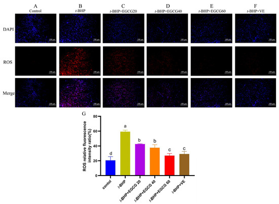 As shown in Figure 2, t-BHP induced a remarkable increase (p < 0.05) of ROS formation in comparison with the control group, while treatment with EGCG resulted in decreased ROS accumulation in the liver compared to the t-BHP group (p < 0.05). There was no significant difference between the t-BHP + EGCG60 group and t-BHP + VE group in reducing liver ROS levels (p > 0.05), but the effect was better than the other levels of EGCG (p < 0.05).