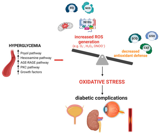 Oxidative stress is an imbalance between oxidants and antioxidants, with a deficit in antioxidants leading to the disruption of redox signaling and molecular damage [9]. Most cells possess intrinsic defense mechanisms involving various enzymes, such as superoxide dismutase (SOD), glutathione peroxidase (GPX), and catalase (CAT), as well as several reducing cofactors including NADH, NADPH, glutathione, and tetrahydrofolate, whose levels help to manage redox potential [10,11]. However, reductions in antioxidant status have been observed in patients with type 2 DM compared to non-diabetic individuals [12]. Metabolic disturbances in DM cause excessive production of reactive oxygen and nitrogen species (ROS/RNS), leading to oxidative stress and cellular damage [13]. (Figure 1 depicts the main oxidative pathways involved in diabetic complications).